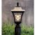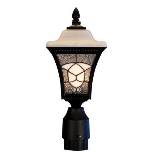 This decorative outdoor light fixture incorporates several different concepts to create an individual style. Each fixture has an Alabaster-like glass lid, leaded stained glass panels and sculptured cast aluminum arms and cage. These fixtures emit a warm and attractive glow that provides ample light for any entrance, porch or deck.