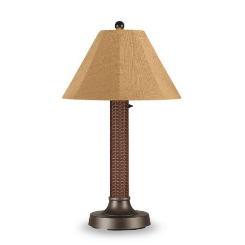 Bahama Weave Outdoor Table Lamp Thick Stand Red Castagno & Bronze. All weather PVC wicker woven base adds dramatic appeal to this outdoor lamp. Choose from many diverse colors of Sunbrella fabric shades. 16 ft. weatherproof cord and plug. Two level dimming switch.