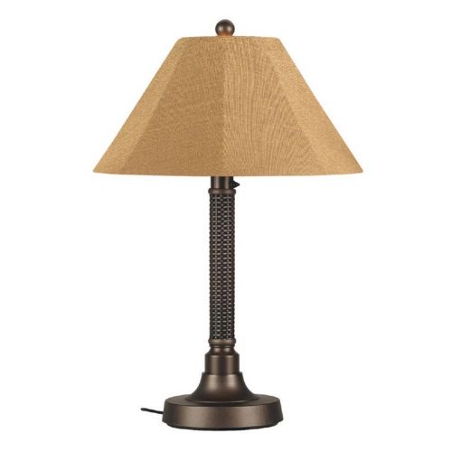 Bahama Weave Outdoor Table Lamp Dark Mahogany & Bronze. All weather PVC wicker woven base adds dramatic appeal to this outdoor lamp. Choose from many diverse colors of Sunbrella fabric shades. 16 ft. weatherproof cord and plug. Two level dimming switch.