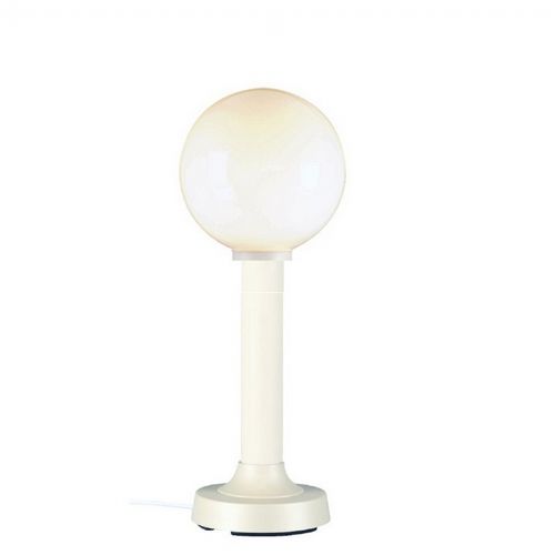 Moonlite 35 inch Outdoor Table Lamp White/White. Moon globe styling with 12" diameter acrylic globe highlights this contemporary outdoor lamp. Features weatherproof all resin construction with heavy weighted base, two level dimming switch and 16 ft. weatherproof cord and plug. Waterproof light bulb enclosure allows the use of a 100 watt light bulb.