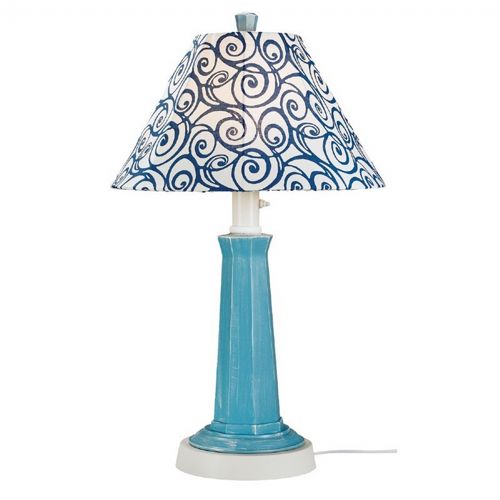 Nantucket Outdoor Table Lamp Curacao Blue. Distressed Curacao blue resin lamp base highlights this stylish outdoor lamp. Two level dimming switch and 16' weatherproof cord and plug. Choose from many diverse colors of Sunbrella fabric shades. Unbreakable polycarbonate waterproof bulb enclosure allows the use of a standard 100 watt light bulb.