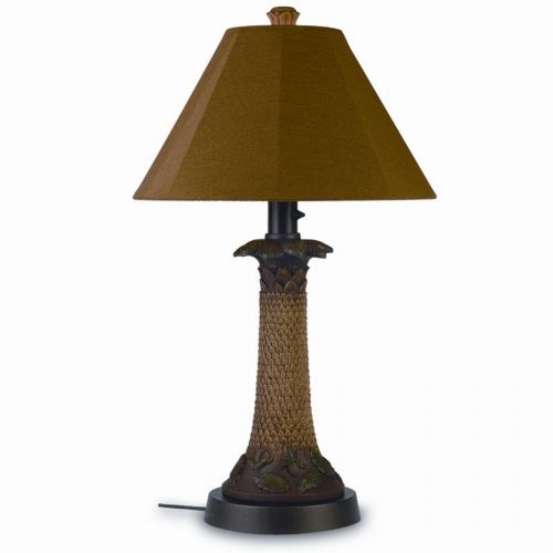 Palm design outdoor table lamp. Tropical design. Adds fashionable tropical styling to any outdoor living area. All lamps feature maintenance free all resin construction with a heavy weighted base. Lamps are completely weatherproof and have a two level dimming switch and weatherproof cord & plug, 16 ft. on the table lamps. Unbreakable polycarbonate waterproof light bulb enclosure allows the use of standard 100 watt light bulb. Outdoor lamps are 35" tall. Many Sunbrella shade colors to choose from.