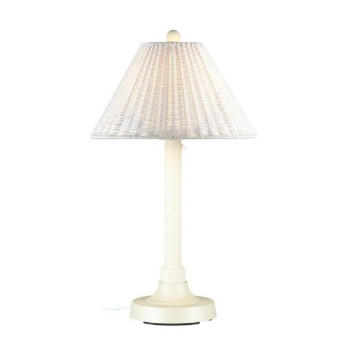 Shangri-la 34 inch Outdoor Wicker Table Lamp White. All-weather full woven pattern, using round PVC wicker highlights this shade, which completes the polycarbonate light globe in this elegant outdoor lamp. Features weatherproof all resin construction with heavy weighted base, two level dimming switch and 16 ft. weatherproof cord and plug. Waterproof light bulb enclosure allows the use of a standard 100 watt light bulb.