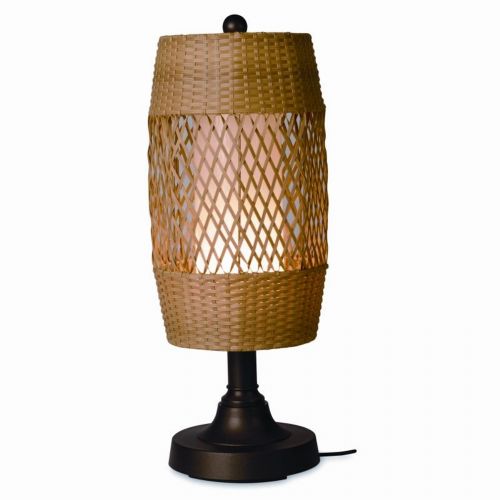 Tonga 30 inch outdoor table lamp from Patio Living Concepts. Antique Honey outdoor wicker shade with diamond center pattern. Bronze color pole and base. All resin construction. Polycarbonate lightbulb enclosure. Uses satndard 100 watt light bulb. Two level dimming switch. Weatherproof 18 feet cord and plug. Table lamp is 30 inches tall. Shade is 21 inches with 12 inches diameter.