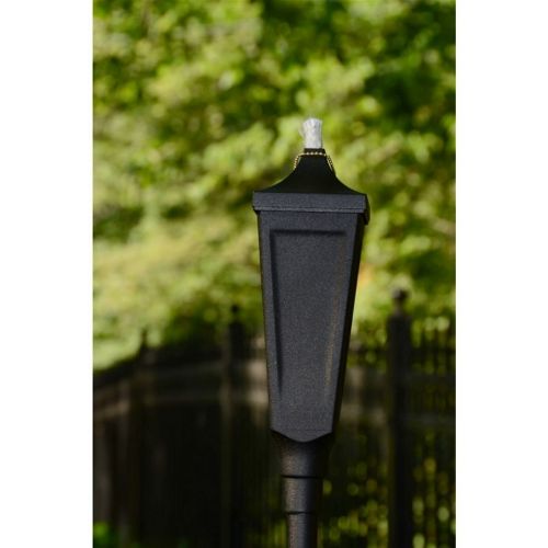 Textured Black Pole garden torches feature superior quality in aluminum die cast construction. Lights after rain or snow. Pole torches are avilable in 6 elegant colors. Extra fuel capacity. Fiberglass wicks only burn oil keeping the wick usable for years. No wood to rot away. No metal container inserts. Features year round outdoor beauty. Available in 6 colors. 63" tall. Set of 2 pole torches. Pole torches stake in ground.