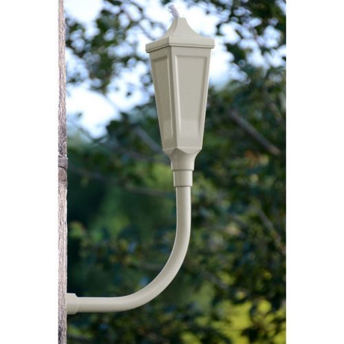 Sandtone Sconce garden torches feature superior quality in aluminum die cast construction. Lights after rain or snow. Sconce oil torches are avilable in 6 elegant colors. Extra fuel capacity. Fiberglass wicks only burn fuel. No wood to rot away. No metal container inserts. Features year round outdoor beauty. 23" tall. Set of 2 sconce torches. Mounting Plate 10" × 3 ½".