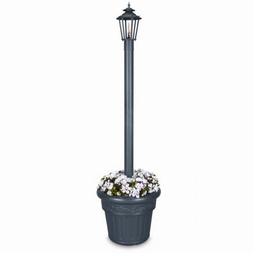 Williamsburg park style single flame torch with planter. English Williamsburg style citronella flame planter lantern. Aluminum construction with powder coated finish. Easy fill containers use standard lamp oil or citronella liquid paraffin fuel to repel insects. A 16 oz. filling will last an entire evening, over 10 hours. Torch has lifetime fiberglass wicks.
