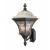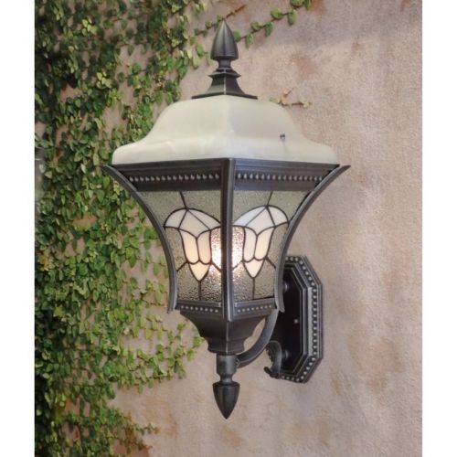 This decorative outdoor light fixture incorporates several different concepts to create an individual style. Each fixture has an Alabaster-like glass lid, leaded stained glass panels and sculptured cast aluminum arms and cage. These fixtures emit a warm and attractive glow that provides ample light for any entrance, porch or deck.