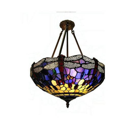 Tiffany style hanging dragonfly lamp. It is handcrafted using the same techniques that were developed by Louis Comfort Tiffany in the early 1900s. This beautiful Tiffany-style piece contains hand-cut pieces of stained glass, each wrapped in fine copper foil. Tiffany style lamp features colorful art glass to brighten any home decor. Its lighting fixture displays primary color of blue. This hanging lamp will dress up any room in your home or office. The dragonfly designs decorate the edges of the shade and has 456 pieces of cut glass along with 96 pcs. of jewels.It has four poles that hold the shade up. This fixture does need to be hard wired and professional installation is recommended.