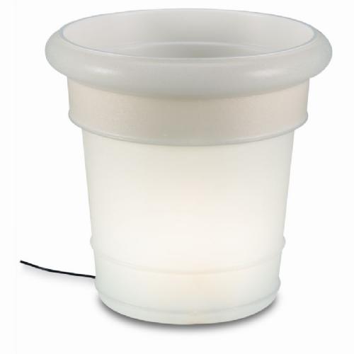 GardenGlo Frost solar planter and outdoor lamp. Elegantly simple design. Large 21 inch planter illuminates your patio. The totally self sufficient solar GardenGlo planter has a separate control unit mounted on a ground stake for positioning in direct sunlight and an on/off switch with auto on function at dusk. Includes 3 AA rechargeable batteries. LED bulbs last 20,000 hours. Resin planter with solar lamps.