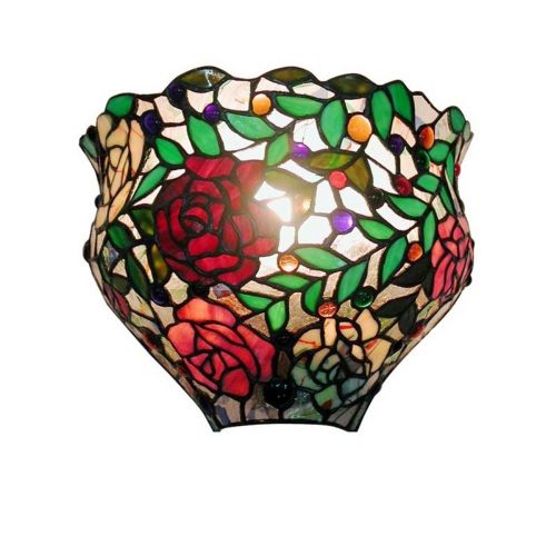 Tiffany-style Red Rose Wall Sconce. Tiffany Style Red Rose Wall Sconce has colorful red, yellow roses and green leaves. Each glass is individually cut and wrapped around copper foil and soldered together.