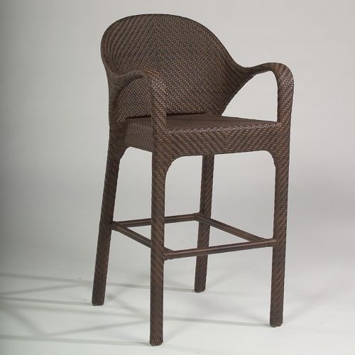 Bar Stool with arms from Whitecraft. Made with aluminum frames woven with synthetic outdoor wicker. Specifically made for outdoors. All weather wicker is resistant to sun, water, rain and snow. Strong aluminum frames. Available in Coffee weave.