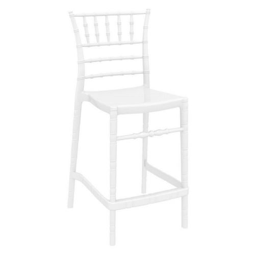 Chiavari polycarbonate party style counter height stool. Classic design. Made from commercial grade polycarbonate. So elegant that it is suitable for indoors, so durable that it is used outdoors. Great for outdoor spaces. Stackable, easy cleaning and UV resistant. Made for outdoor use but can be used indoors. Preferred by weddings, parties, birthdays. Certified for strict European standards by CATAS Italian research institute and test laboratory.
