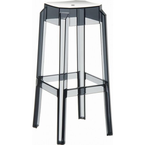 Fox polycarbonate outdoor barstool. Modern contemporary design. Can be used both indoors and outdoors. Scratch resistant. Commercial grade plastic polycarbonate resin. Strong legs and structure. Stackable. Very elegant. Color: Transparent Gray.