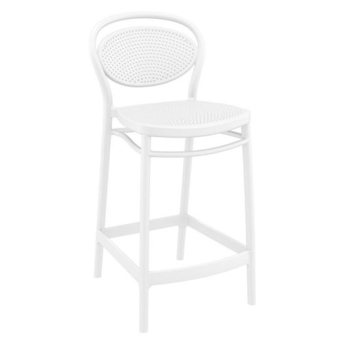 White outdoor counter high chair. Classic design. Made from polypropylene resin with gas injection molded legs. Suitable for indoors and outdoors. Perfect for heavy use areas. Suitable for restaurants, cafes and hotels.
