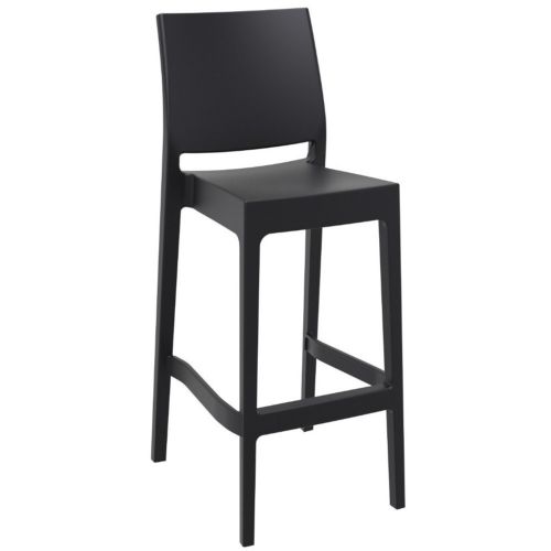 Black Maya indoor-outdoor barstool. Made from commercial grade resin with gas injection molded legs. So elegant that it is suitable for indoors, so durable that it is used outdoors. Perfect for heavy use areas. Great for outdoor spaces or high traffic indoor spaces. Preferred by yogurt shops, outdoor cafes, ice cream shops, outdoor restaurants and hotels. Stools are stackable, easy cleaning and UV resistant. Certified for strict European standards by CATAS Italian research institute and test laboratory.