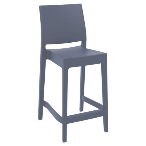 Dark gray Maya indoor-outdoor counter height stool. Made from commercial grade resin with gas injection molded legs. So elegant that it is suitable for indoors, so durable that it is used outdoors. Perfect for heavy use areas. Great for outdoor spaces or high traffic indoor spaces. Preferred by yogurt shops, outdoor cafes, ice cream shops, outdoor restaurants and hotels. Stools are stackable, easy cleaning and UV resistant. Certified for strict European standards by CATAS Italian research institute and test laboratory.