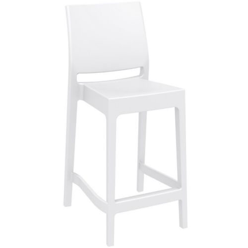White Maya indoor-outdoor counter height stool. Made from commercial grade resin with gas injection molded legs. So elegant that it is suitable for indoors, so durable that it is used outdoors. Perfect for heavy use areas. Great for outdoor spaces or high traffic indoor spaces. Preferred by yogurt shops, outdoor cafes, ice cream shops, outdoor restaurants and hotels. Stools are stackable, easy cleaning and UV resistant. Certified for strict European standards by CATAS Italian research institute and test laboratory.