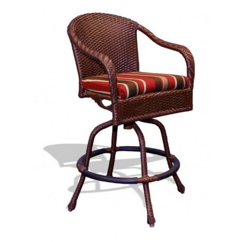 Sea Pines collection swivel outdoor bar chair from Tortuga Outdoor. Traditional wicker offers classic designs with extreme all weather durability. Collection items feature powder coated aluminum frames, UV stabilized all weather wicker, and 100% spun polyester, mildew and fade resistant outdoor cushions. Traditional looks for a classic comfort. Wicker offered in coffee brown.