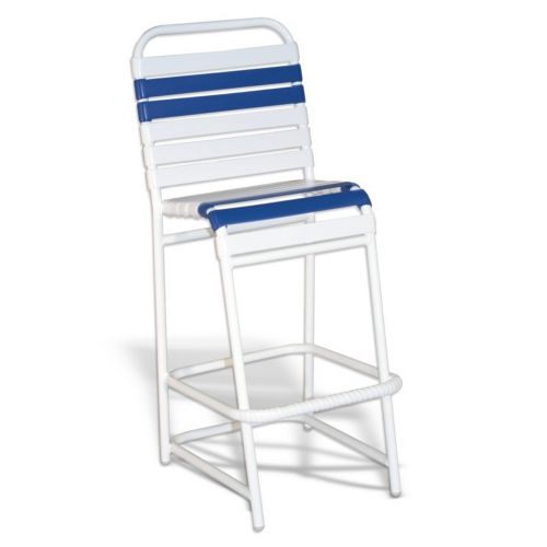 Strap commercial bar chair. Aluminum white powder coated frames resistant to outdoor environments sun, rain and suntanning lotions. 2 inch thick PVC vinyl is made with 100% virgin vinyl against breakage. Double wrap strapping. Vinyl straps contain UV inhibitors for resistancy under sun. Dimensions: 24"L × 18"W × 45"H. White frames with white straps with 4 accent contrast colored straps. Choose from 6 accent colors. Made in USA.