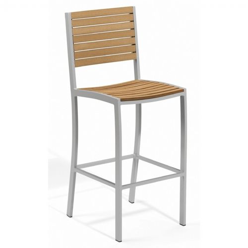 Travira outdoor bar chair from Oxford Garden. The straight lines and subtle curves of this chair show off it's unique design. All edges have been radiused for a smooth touch. Front to rear solid leg aluminum bracing improves stability. Larger footrest with radiused front is designed for extended sitting. Travira furniture will last for years to come and is a great fit for any outdoor space.