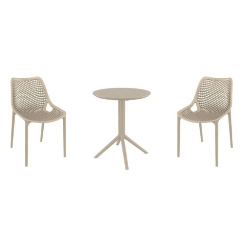 Transform your small outdoor area into a stylish space with Air chairs and Sky 24" round folding table 3 piece bistro set in taupe. Made from durable polypropylene resin, this bistro set is perfect for balconies, terraces, decks, patios, cafes and restaurants. Air chairs feature a sleek and contemporary design that adds a touch of sophistication to any space. Sky 24" round folding table provides plenty of room for two people to sit and enjoy a meal or drink together.