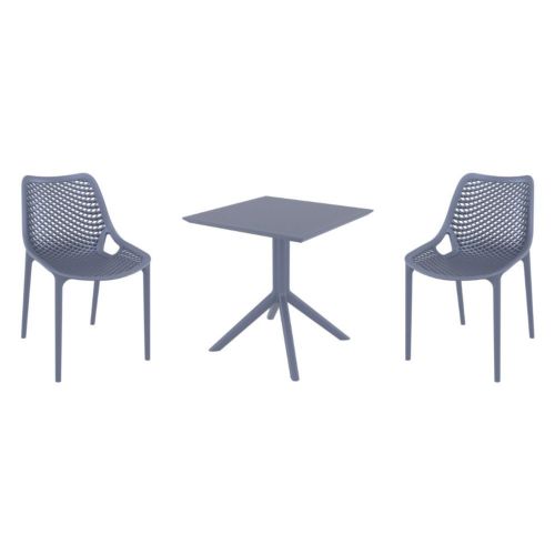 Introducing the Air chairs and Sky 27" square table 3 piece dining set in Dark Gray - the perfect addition to any small outdoor living area! Crafted from high-quality polypropylene resin, this set is durable and weather-resistant, ensuring it will last you for years to come. Air chairs feature a sleek and modern design, with a comfortable seat and backrest. Sky 27" square table providing ample space for two people to enjoy a meal or drink together.