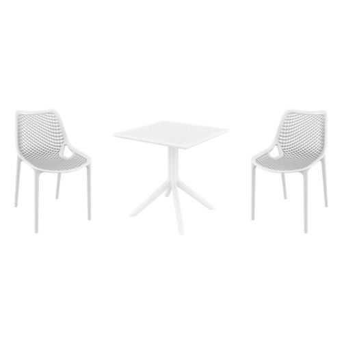 Introducing the Air chairs and Sky 27" square table 3 piece dining set in White - the perfect addition to any small outdoor living area! Crafted from high-quality polypropylene resin, this set is durable and weather-resistant, ensuring it will last you for years to come. Air chairs feature a sleek and modern design, with a comfortable seat and backrest. Sky 27" square table providing ample space for two people to enjoy a meal or drink together.