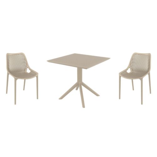 Introducing the Air chairs and Sky 31" square table 3 piece dining set in Taupe - the perfect addition to any small outdoor living area! Crafted from high-quality polypropylene resin, this set is durable and weather-resistant, ensuring it will last you for years to come. Air chairs feature a sleek and modern design, with a comfortable seat and backrest. Sky 31" square table providing ample space for two people to enjoy a meal or drink together.