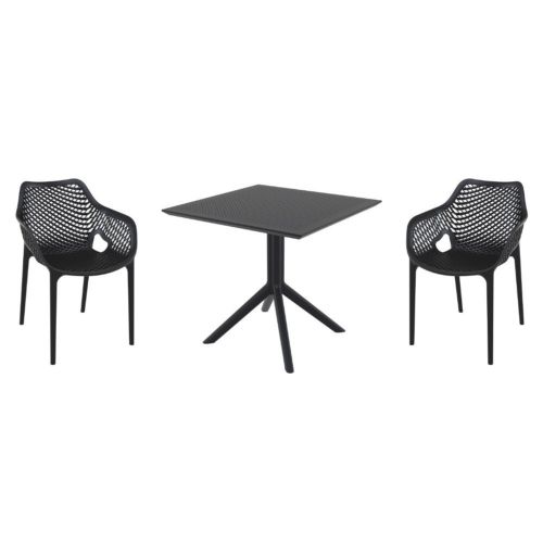 Introducing the Air XL arm chairs and Sky 31" square table 3 piece dining set in Black - the perfect addition to any small outdoor living area! Crafted from high-quality polypropylene resin, this set is durable and weather-resistant, ensuring it will last you for years to come. Air XL arm chairs feature a sleek and modern design, with a comfortable seat and backrest. Sky 31" square table providing ample space for two people to enjoy a meal or drink together.