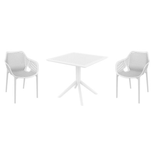 Introducing the Air XL arm chairs and Sky 31" square table 3 piece dining set in White - the perfect addition to any small outdoor living area! Crafted from high-quality polypropylene resin, this set is durable and weather-resistant, ensuring it will last you for years to come. Air XL arm chairs feature a sleek and modern design, with a comfortable seat and backrest. Sky 31" square table providing ample space for two people to enjoy a meal or drink together.