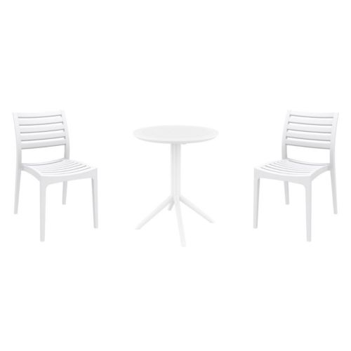 Transform your small outdoor area into a stylish space with Ares chairs and Sky 24" round folding table 3 piece bistro set in white. Made from durable polypropylene resin, this bistro set is perfect for balconies, terraces, decks, patios, cafes and restaurants. Ares chairs feature a sleek and contemporary design that adds a touch of sophistication to any space. Sky 24" round folding table provides plenty of room for two people to sit and enjoy a meal or drink together.