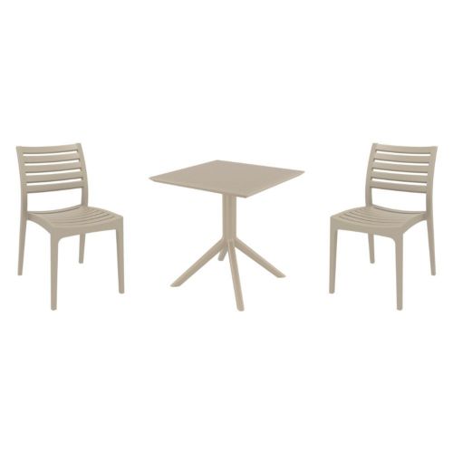 Introducing the Ares chairs and Sky 27" square table 3 piece dining set in Taupe - the perfect addition to any small outdoor living area! Crafted from high-quality polypropylene resin, this set is durable and weather-resistant, ensuring it will last you for years to come. Ares chairs feature a sleek and modern design, with a comfortable seat and backrest. Sky 27" square table providing ample space for two people to enjoy a meal or drink together.