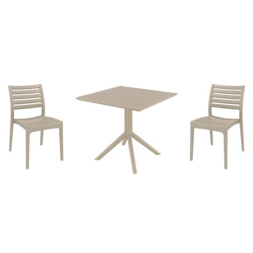 Introducing the Ares chairs and Sky 31" square table 3 piece dining set in Taupe - the perfect addition to any small outdoor living area! Crafted from high-quality polypropylene resin, this set is durable and weather-resistant, ensuring it will last you for years to come. Ares chairs feature a sleek and modern design, with a comfortable seat and backrest. Sky 31" square table providing ample space for two people to enjoy a meal or drink together.