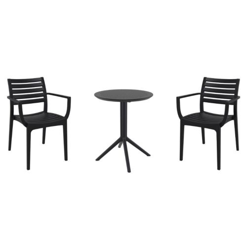 Transform your small outdoor area into a stylish space with Artemis arm chairs and Sky 24" round folding table 3 piece bistro set in black. Made from durable polypropylene resin, this bistro set is perfect for balconies, terraces, decks, patios, cafes and restaurants. Artemis arm chairs feature a sleek and contemporary design that adds a touch of sophistication to any space. Sky 24" round folding table provides plenty of room for two people to sit and enjoy a meal or drink together.