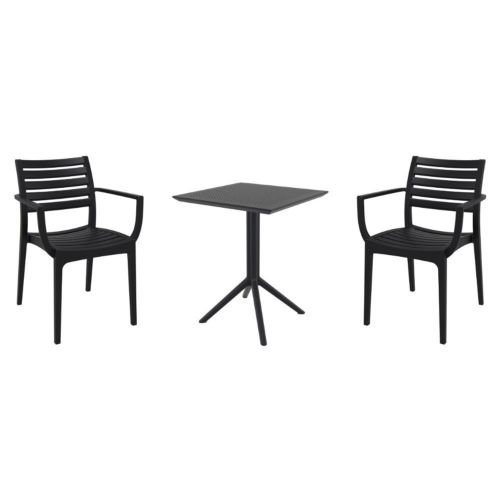 Transform your small outdoor area into a stylish space with Artemis arm chairs and Sky 24" square folding table 3 piece bistro set in black. Made from durable polypropylene resin, this bistro set is perfect for balconies, terraces, decks, patios, cafes and restaurants. Artemis arm chairs feature a sleek and contemporary design that adds a touch of sophistication to any space. Sky 24" square folding table provides plenty of room for two people to sit and enjoy a meal or drink together.