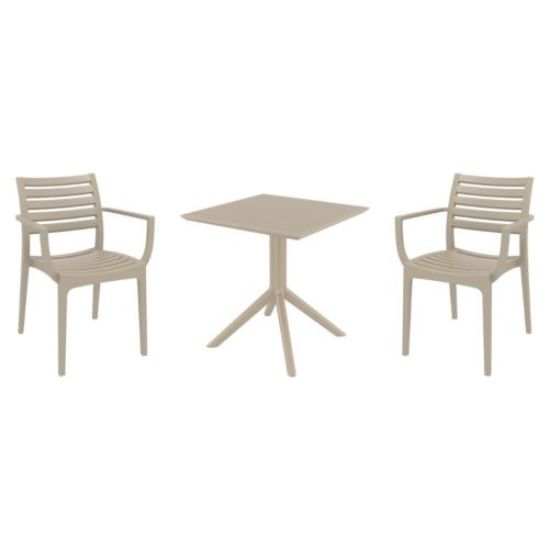 Introducing the Artemis arm chairs and Sky 27" square table 3 piece dining set in Taupe - the perfect addition to any small outdoor living area! Crafted from high-quality polypropylene resin, this set is durable and weather-resistant, ensuring it will last you for years to come. Artemis arm chairs feature a sleek and modern design, with a comfortable seat and backrest. Sky 27" square table providing ample space for two people to enjoy a meal or drink together.