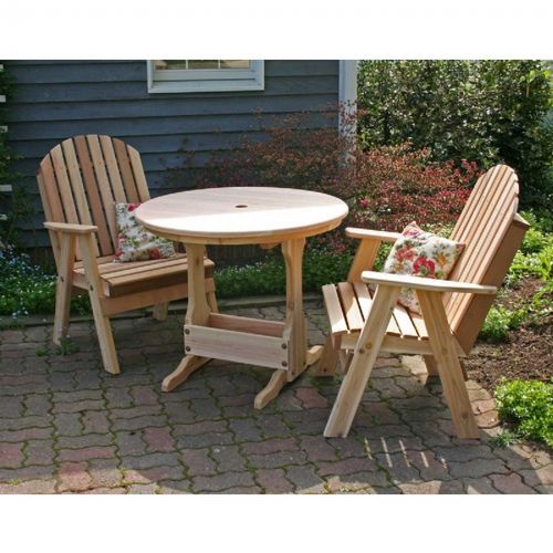 Cedar fanback bistro set natural. This fanback bistro set is incredibly elegant, and the table top includes an optional 2" umbrella hole for a fantastic market umbrella that will add a splash of color. The collection includes, 2 chairs and 1 table.The hardware is zinc plated steel. It features two separate option for stain/sealer in cedar or white with an additional fee of 28%. It is made in the U.S.A.
