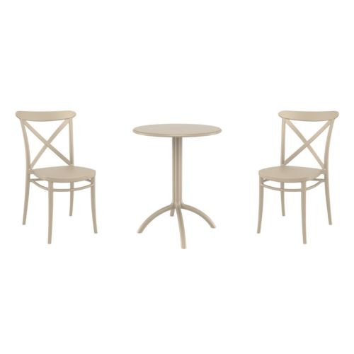 Transform your small outdoor area into a stylish space with Cross chairs and Octopus 24" round table 3 piece bistro set in taupe. Made from durable polypropylene resin, this bistro set is perfect for balconies, terraces, decks, patios, cafes and restaurants. Cross chairs feature a sleek and contemporary design that adds a touch of sophistication to any space. Octopus 24" round table provides plenty of room for two people to sit and enjoy a meal or drink together.