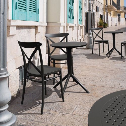 Transform your small outdoor area into a stylish space with Cross chairs and Sky 24" round folding table 3 piece bistro set in black. Made from durable polypropylene resin, this bistro set is perfect for balconies, terraces, decks, patios, cafes and restaurants. Cross chairs feature a sleek and contemporary design that adds a touch of sophistication to any space. Sky 24" round folding table provides plenty of room for two people to sit and enjoy a meal or drink together.