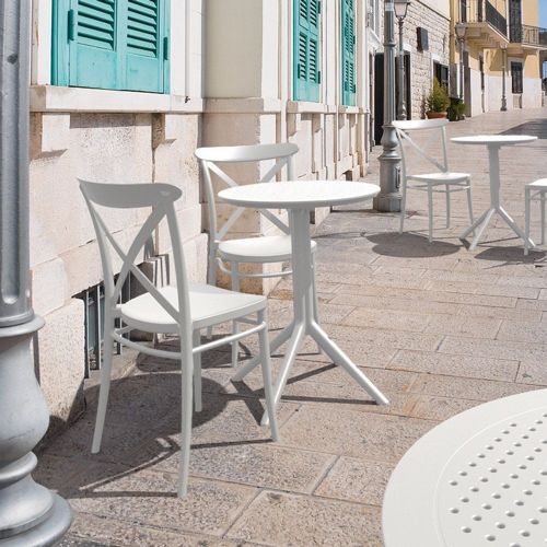 Transform your small outdoor area into a stylish space with Cross chairs and Sky 24" round folding table 3 piece bistro set in white. Made from durable polypropylene resin, this bistro set is perfect for balconies, terraces, decks, patios, cafes and restaurants. Cross chairs feature a sleek and contemporary design that adds a touch of sophistication to any space. Sky 24" round folding table provides plenty of room for two people to sit and enjoy a meal or drink together.