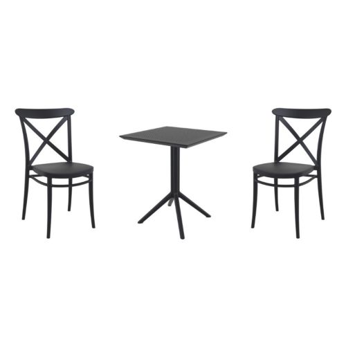 Transform your small outdoor area into a stylish space with Cross chairs and Sky 24" square folding table 3 piece bistro set in black. Made from durable polypropylene resin, this bistro set is perfect for balconies, terraces, decks, patios, cafes and restaurants. Cross chairs feature a sleek and contemporary design that adds a touch of sophistication to any space. Sky 24" square folding table provides plenty of room for two people to sit and enjoy a meal or drink together.