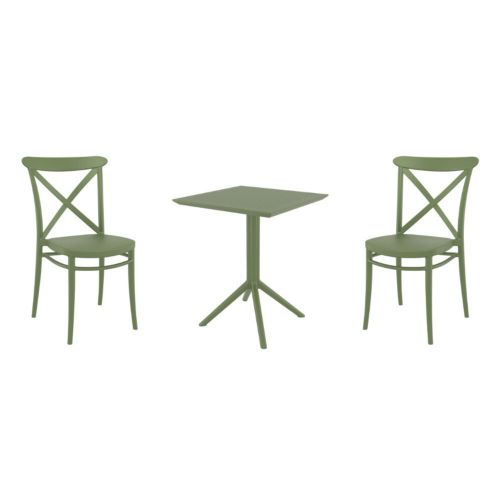 Transform your small outdoor area into a stylish space with Cross chairs and Sky 24" square folding table 3 piece bistro set in olive green. Made from durable polypropylene resin, this bistro set is perfect for balconies, terraces, decks, patios, cafes and restaurants. Cross chairs feature a sleek and contemporary design that adds a touch of sophistication to any space. Sky 24" square folding table provides plenty of room for two people to sit and enjoy a meal or drink together.