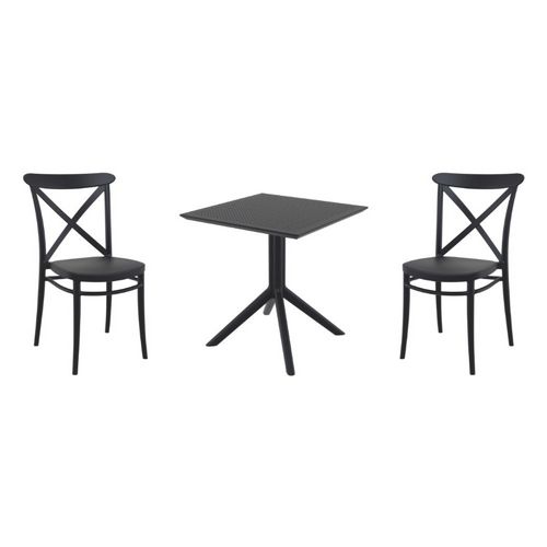 Introducing the Cross chairs and Sky 27" square table 3 piece dining set in Black - the perfect addition to any small outdoor living area! Crafted from high-quality polypropylene resin, this set is durable and weather-resistant, ensuring it will last you for years to come. Cross chairs feature a sleek and modern design, with a comfortable seat and backrest. Sky 27" square table providing ample space for two people to enjoy a meal or drink together.