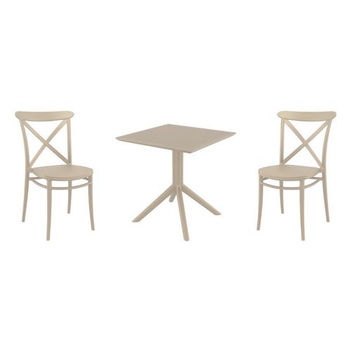 Introducing the Cross chairs and Sky 27" square table 3 piece dining set in Taupe - the perfect addition to any small outdoor living area! Crafted from high-quality polypropylene resin, this set is durable and weather-resistant, ensuring it will last you for years to come. Cross chairs feature a sleek and modern design, with a comfortable seat and backrest. Sky 27" square table providing ample space for two people to enjoy a meal or drink together.