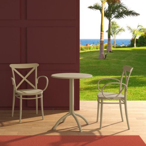 Transform your small outdoor area into a stylish space with Cross XL arm chairs and Octopus 24" round table 3 piece bistro set in taupe. Made from durable polypropylene resin, this bistro set is perfect for balconies, terraces, decks, patios, cafes and restaurants. Cross XL arm chairs feature a sleek and contemporary design that adds a touch of sophistication to any space. Octopus 24" round table provides plenty of room for two people to sit and enjoy a meal or drink together.