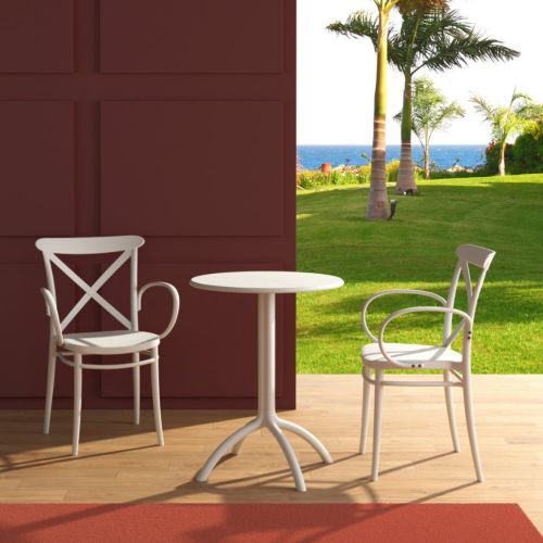 Transform your small outdoor area into a stylish space with Cross XL arm chairs and Octopus 24" round table 3 piece bistro set in white. Made from durable polypropylene resin, this bistro set is perfect for balconies, terraces, decks, patios, cafes and restaurants. Cross XL arm chairs feature a sleek and contemporary design that adds a touch of sophistication to any space. Octopus 24" round table provides plenty of room for two people to sit and enjoy a meal or drink together.
