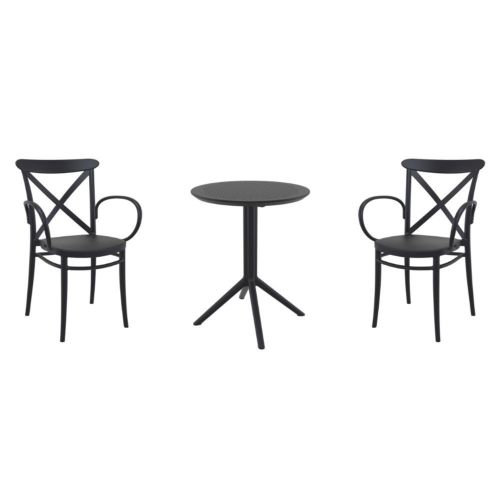 Transform your small outdoor area into a stylish space with Cross XL arm chairs and Sky 24" round folding table 3 piece bistro set in black. Made from durable polypropylene resin, this bistro set is perfect for balconies, terraces, decks, patios, cafes and restaurants. Cross XL arm chairs feature a sleek and contemporary design that adds a touch of sophistication to any space. Sky 24" round folding table provides plenty of room for two people to sit and enjoy a meal or drink together.