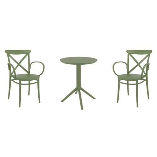 Transform your small outdoor area into a stylish space with Cross XL arm chairs and Sky 24" round folding table 3 piece bistro set in olive green. Made from durable polypropylene resin, this bistro set is perfect for balconies, terraces, decks, patios, cafes and restaurants. Cross XL arm chairs feature a sleek and contemporary design that adds a touch of sophistication to any space. Sky 24" round folding table provides plenty of room for two people to sit and enjoy a meal or drink together.