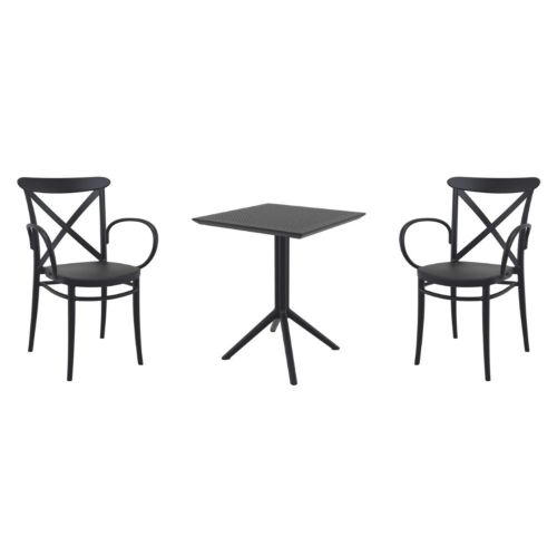 Transform your small outdoor area into a stylish space with Cross XL arm chairs and Sky 24" square folding table 3 piece bistro set in black. Made from durable polypropylene resin, this bistro set is perfect for balconies, terraces, decks, patios, cafes and restaurants. Cross XL arm chairs feature a sleek and contemporary design that adds a touch of sophistication to any space. Sky 24" square folding table provides plenty of room for two people to sit and enjoy a meal or drink together.
